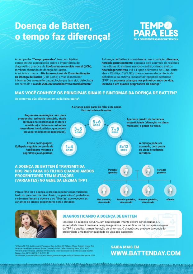 Um exemplo de iniciativa está a campanha “Tempo para eles” que conta com ações para a conscientização da doença com o engajamento nas redes sociais, por meio das hashtags #BattenDay e #TEMPOPARAELES. Para saber mais, acesse: https://www.battenday.com